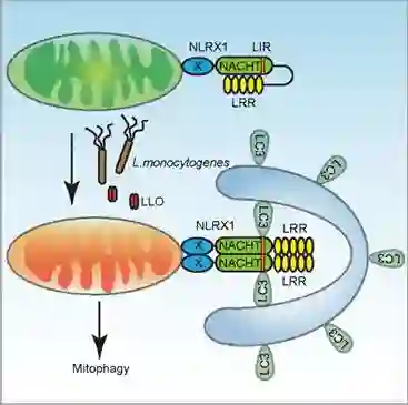 图:李斯特菌通过其分泌的毒素蛋白LLO诱导线粒体损伤,促进NLRX1发生多聚化并与自噬蛋白LC3结合进而促进线粒体自噬通路的激活。