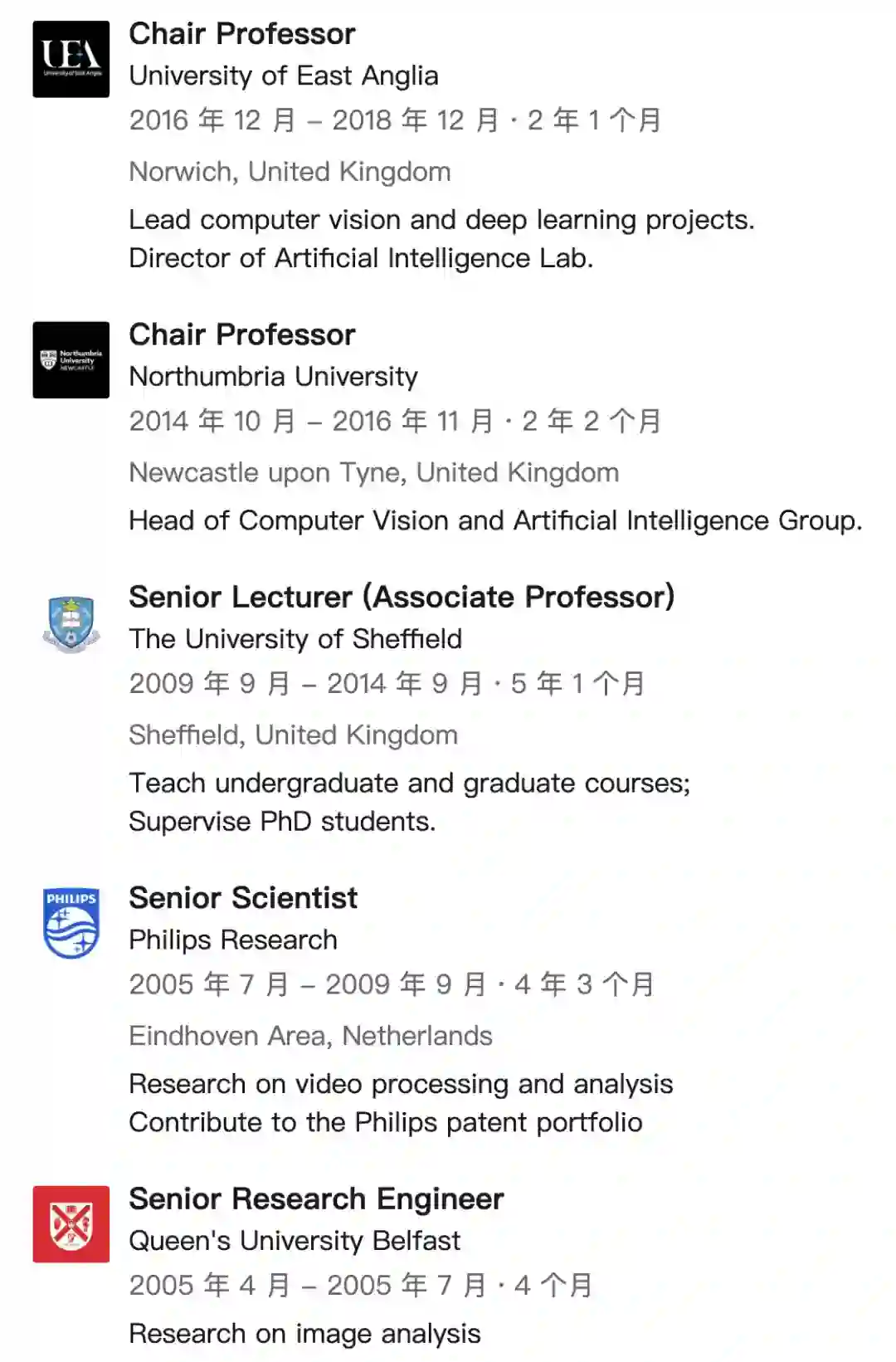 邵博士在英国著名的高等教育机构中推动AI领域发展已有十余年的时间,包括在谢菲尔德大学担任高级讲师,去诺森比亚大学以及东英吉利大学担任讲座教授,他还曾担任Artificial Intelligence Lab主任。