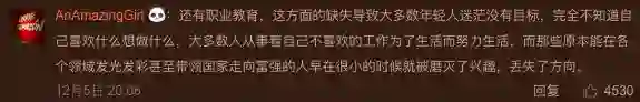 而这条微博下面的最高赞评论则提到了职业教育:“这方面的缺失导致大多数年轻人迷茫没有目标,完全不知道自己喜欢什么想做什么,大多数人从事着自己不喜欢的工作为了生活而努力生活,而那些原本能在各个领域发光发彩甚至带领国家走向富强的人早在很小的时候就被磨灭了兴趣、丢失了方向。”