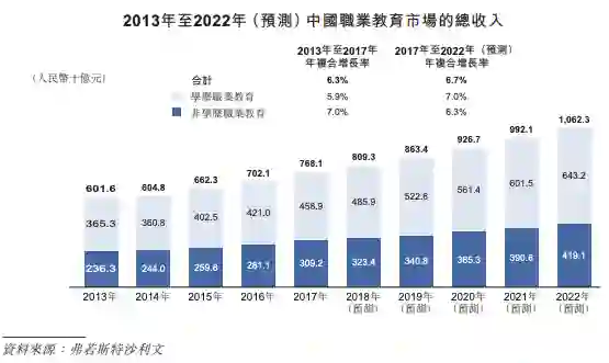 根据教育部资料与弗若斯特沙利文报告,由于培训人次及学费的增加,中国职业教育行业的总收入从2013年的6016亿元人民币增长到2017年的7681亿元人民币,年复合增长率为6.3%,预计至2022年将达到10623亿元。