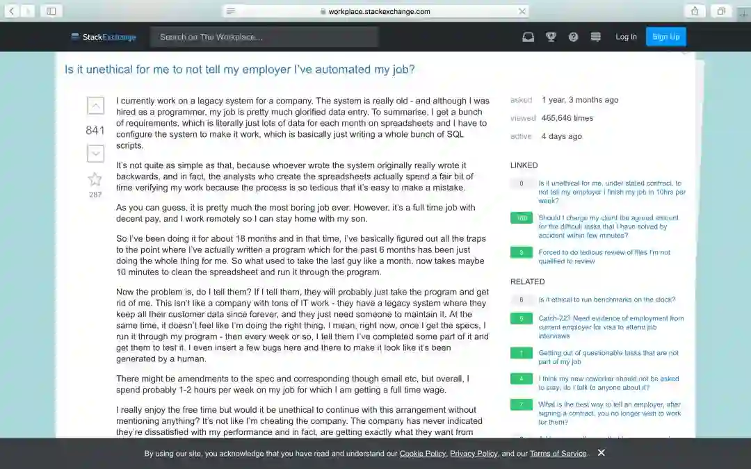 大概一年后,一个自称是Etherable的用户向互联网上最重要的程序员论坛之一Stack Exchange上的Workplace版块发了一个问询帖(https://workplace.stackexchange.com/questions/93696/is-it-unethical-for-me-to-not-tell-my-employer-i-ve-automated-my-job):