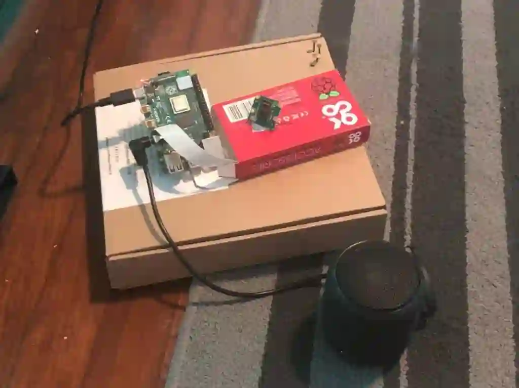 设置好了整个设备,它包括一个树莓派,一个摄像头和一个小音响。小音响的作用是来进行反馈。