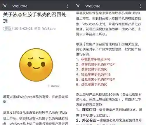以下WeStore公众号发布的“关于液态硅胶手机壳的召回处理”公告原内容: