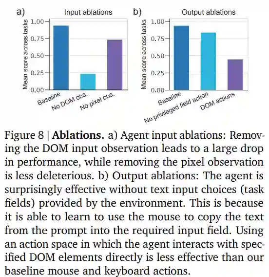 该智能体使用像素和 DOM 信息,并且可以配置为支持一系列不同的操作。该研究进行了消融实验以了解各种架构选择的重要性。