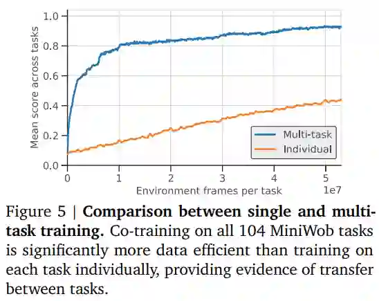 研究者发现,与在每个任务上单独训练的智能体相比,在 MiniWob++ 的全部 104 个任务上训练一个智能体可以显著提升性能,如下图 5 所示。