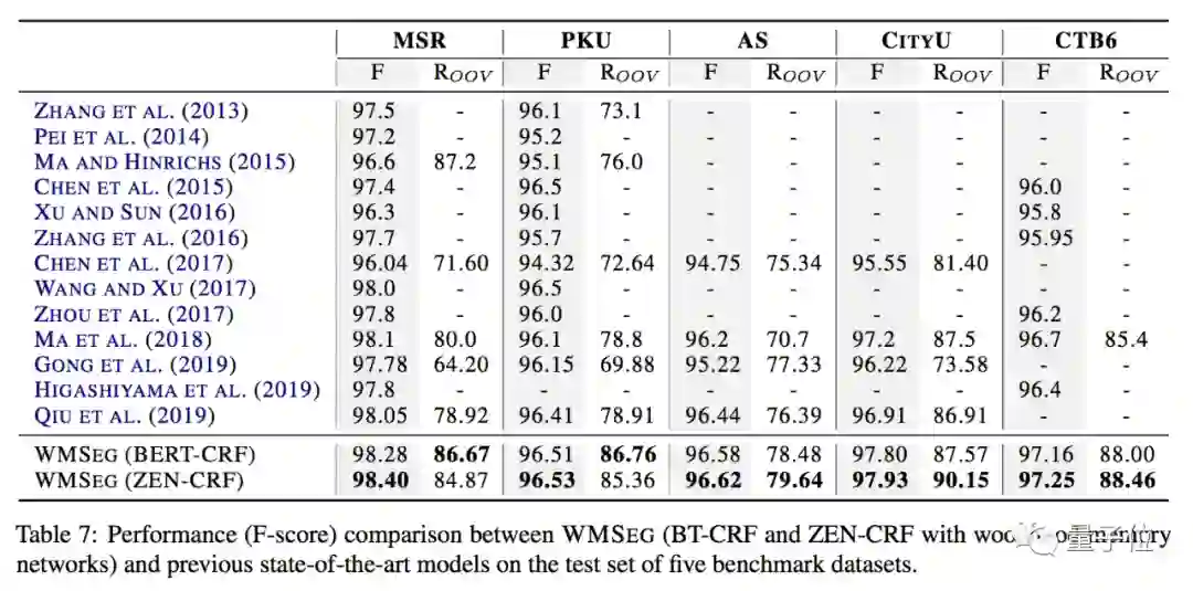 WMSeg,在MSR、PKU、AS、CityU、CTB6这5个数据集上的表现,均达了最好的成绩。