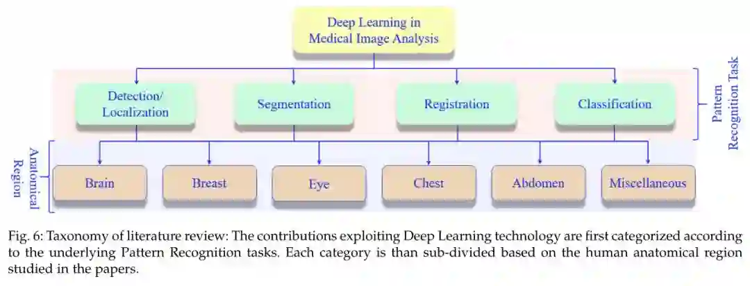 医学图像分析主要包含的模式识别任务是检测/定位、分割、配准、分类。常见的医学影像包括Brain、Breast、Eye、Chest、Abdomen等。