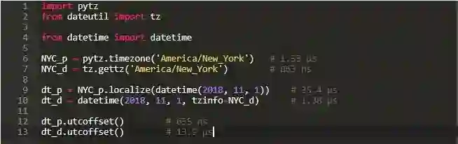 这篇文章的标题声称,pytz是西方最快的步枪,我的意思是pytz是一个非常优化的库,历史上它比dateutil.tz更快。 在最近的几次发布中,性能差距已经大大缩小[4],但由于计算的惰性和急切性,在某些用例中性能仍然存在持续差距。 为了演示,我使用IPython的%timeit魔法在python 3.6上定时pytz == 2018.3和python-dateutil == 2.7.0,并且在每个函数之后都将耗费的时间放在注释中: