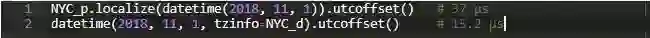 由于localize函数急切地将EST附加到日期时间,因此不会响应计算,不会更新偏移量。 为了解决这个错误,每当你在pytz-aware datetime上进行任何算术运算时,你都需要调用normalize函数: