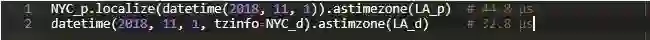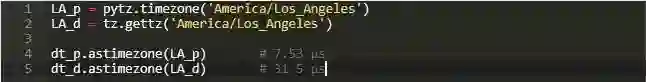dateutil在这个操作中速度较慢,因为它需要计算纽约和洛杉矶的UTC偏移量,而pytz显然从UTC比从最初的日期时间能更快地创建本地化的日期时间(否则会花费至少另一本地化的代价)。 但是,如果您只计划在每个本地化日期时间内只进行一次时区转换,则操作的全部成本为: