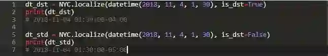 既然它与Python的标准时区模型没有很好的匹配,为什么pytz还要以这种方式设计?考虑在夏令时转换期间发生的模糊日期时间的情况,例如, 2018-11-04 01:30-04:00,以及一小时后,2018-11-04 01:30-05:00。 你将如何编写一个函数,该函数采用该日期时间的2018-11-04 01:30部分,并返回正确答案? 不可能,因为有两个正确的答案。