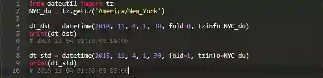 这是因为有些关于日期时间的信息(它表示的DST的哪一侧)现在被编码在附加到它的tzinfo中。 使用标准的Python接口,直到Python 3.6引入PEP 495才解决了这个问题,PEP 495将fold属性添加到了datetime类中。 这允许“我不确定的日期时间的哪一侧”的决策在日期时间本身进行编码,从而允许延迟计算不明确的日期时间。 如果dt.fold为0,则不明确的日期时间将解析为给定区域中第一次出现的时间,如果它为1,则它们解析为第二次出现。 这里给出代表上面的例子: