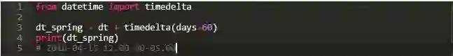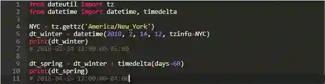 在日期时间模块中,Python提供对时区而不是时区偏移量的支持 - 也就是说,datetime.tzinfo对象预计不会提供固定的偏移量和名称,而是提供用于解释时区信息是什么的一组规则作为datetime的函数。 这就是下面这段代码会起作用的原因: