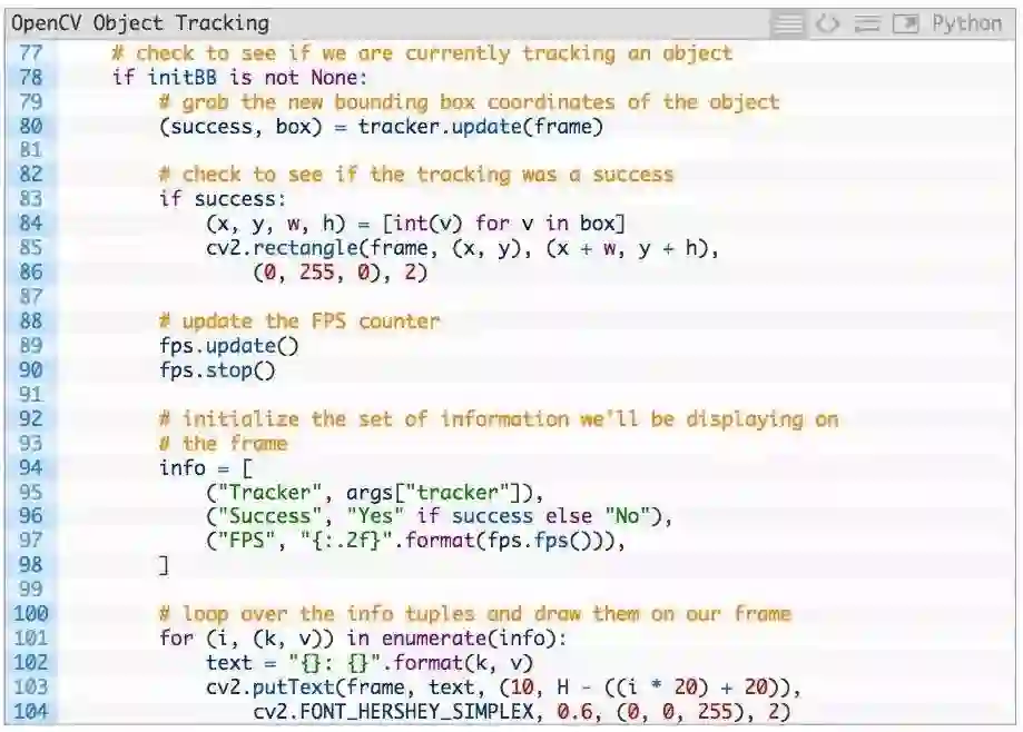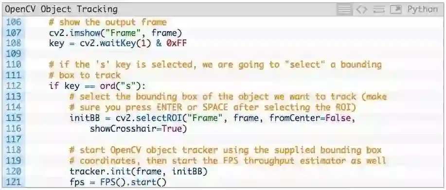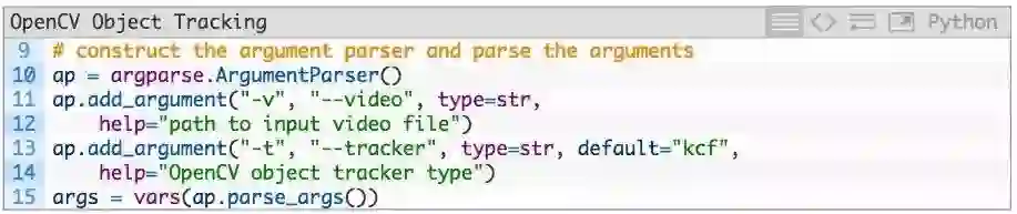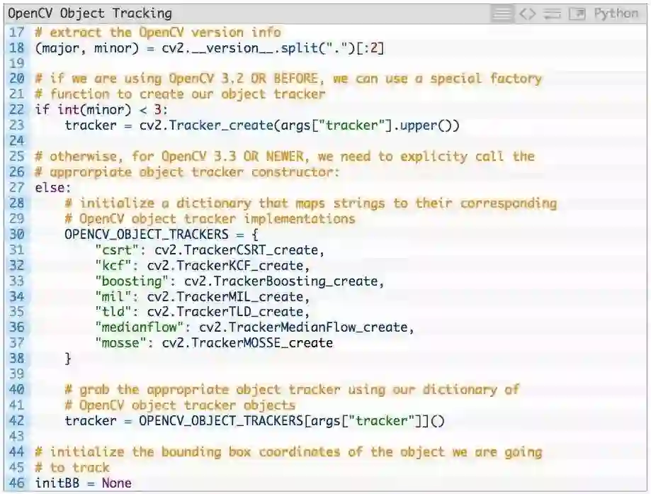 对于3.3以上的版本,每个追踪器可以用各自的函数创造,如cv2. TrackerKCF_create。词典OPENCV_OBJECT_TRACKERS包含了7种OpenCV的目标追踪器(30—38行)。它将目标追踪器的命令行参数字符串映射到实际的OpenCV追踪器函数上。
