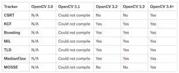 从OpenCV 3开始,目标检测器得到了快速发展,下表总结了不同版本的OpenCV中可食用的追踪器: