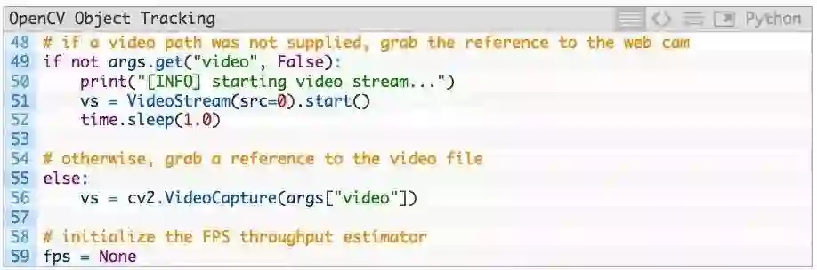 接着--video命令行参数会出现,所以我们可以从视频文件中对视频流进行初始化(55—56行)。