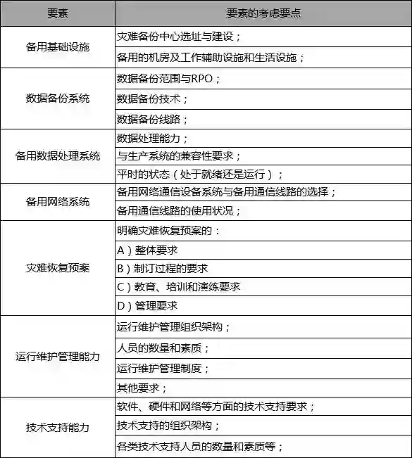 在明确了灾备建设中灾难恢复能力等级目标之后,另一个重要问题是在具体建设中应该考虑哪些资源要素。下表是对灾备建设的七要素: