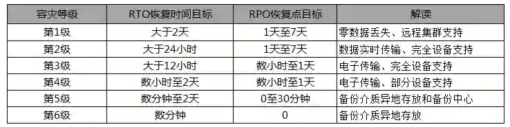 以下是《信息安全技术信息系统灾难恢复规范》对灾备数据中心根据RPO与RTO两项指标分成了6个相应的等级: