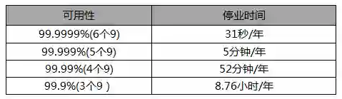 业界通常会用N个9来体现可用性程度,计算方法是:可用性=平均故障间隔时间MTBF/(平均修复时间MTTR +平均故障间隔时间MTBF)