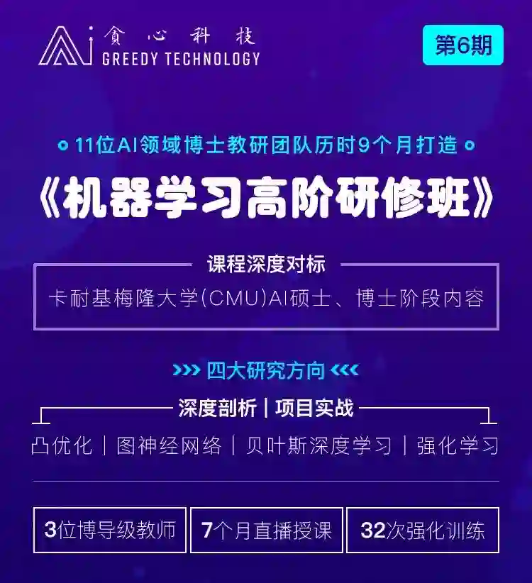 如果你准备发AI方向的论文,或准备从事科研工作或已在企业中担任AI算法岗的工作。那么我真诚的向大家推荐,贪心学院《高阶机器学习研修班》,目前全网上应该找不到类似体系化的课程。课程精选了四大主题进行深入的剖析讲解,四个模块分别为凸优化、图神经网络、强化学习、贝叶斯深度学习。