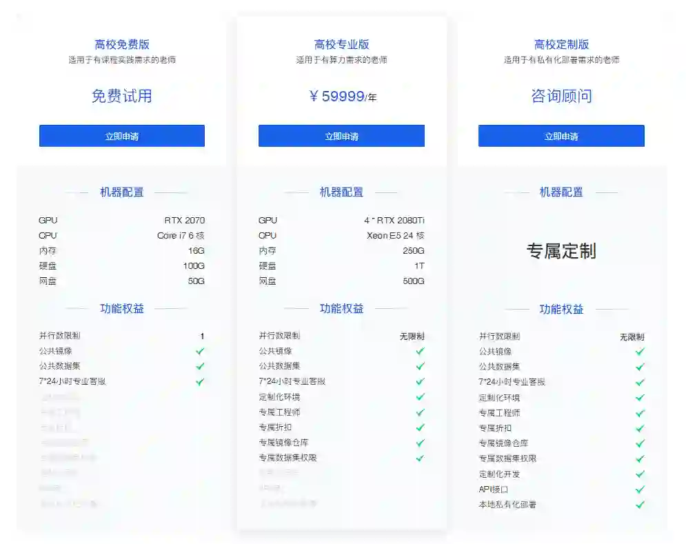 免费申请。同时矩池云还推出了高校专业版和高校定制版,来满足校园教育场景下对深度学习平台的不同需求。