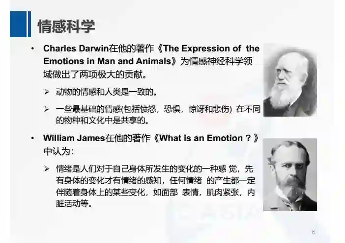 Charles Darwin为情感领域做了两大贡献,一个是提出动物情感和人类情感是一致的,另一个是最基础的情感,包括愤怒、恐惧、悲伤等,在不同物种和文化中是共享的。第二点不仅在情感上适用,在语言上也是适用的,比如在不同的人种和文化中,“爸爸”、“妈妈”发音都是比较类似的。William在著作中认为情绪是人们对于自己身体所发生变化的一种感觉,先是有身体的变化才有情绪的感知,任何情绪的产生都有一定伴随身体的变化,包括面部表情、肌肉紧张、内脏活动等,可以通过外部感知推测情绪发生了什么样的变化。