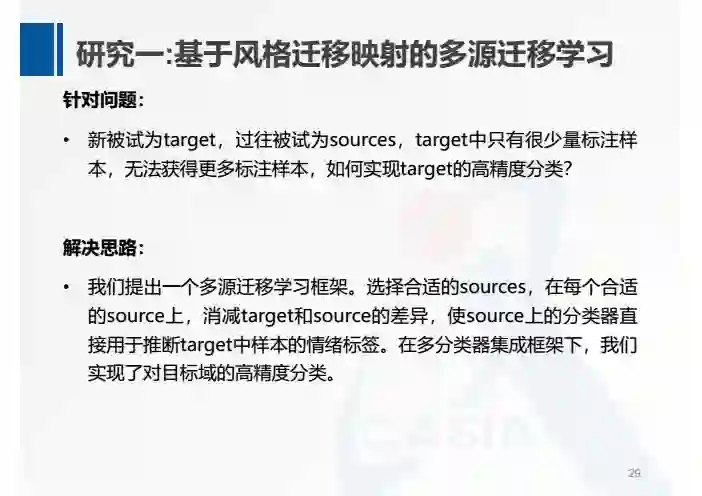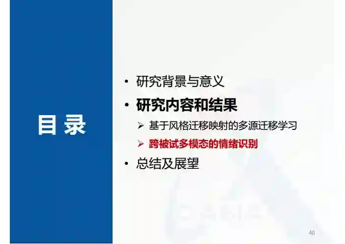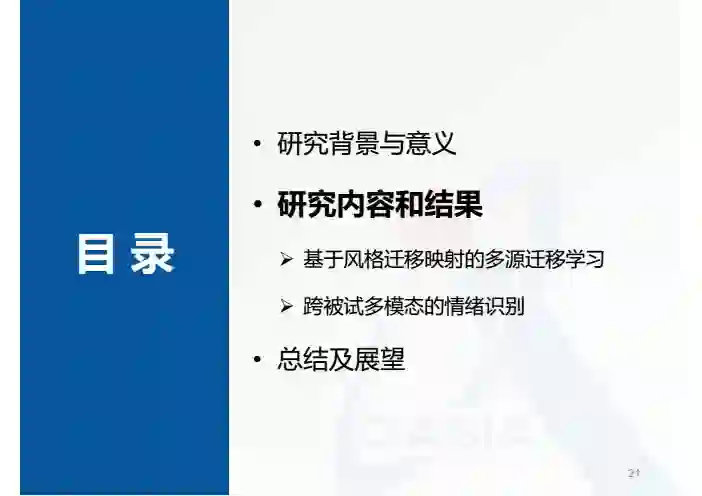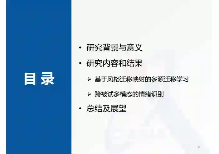 今天我向大家介绍一下我们组近期的两个工作。一个是关于风格迁移映射的多元迁移学习,第二是跨被试多模态情绪学习。