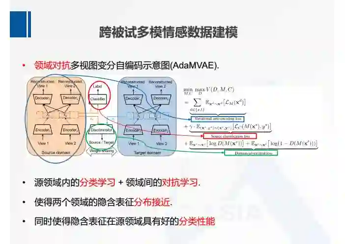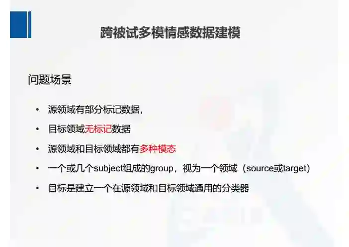 现在我们来看一下跨被试多模态数据建模场景。源领域有部分标记数据,这是半监督的,目标领域都是没有标记的。源领域和目标领域都有多种模态,目标是做一个目标领域和源领域通用的分类器。