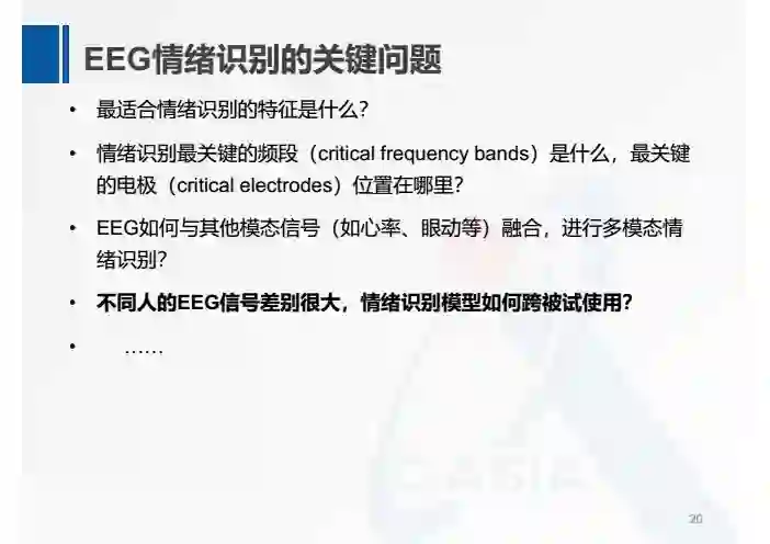 EEG情绪识别里面有哪些关键问题呢?情绪识别有哪些特征比较好?情绪识别最关键的频段和电极位置在哪里?EEG如何与其他模态信号进行多模态情绪识别?并且不同人的EEG信号差别很大,怎样把这个人的模型用到另外一个人模型上也值得思考。