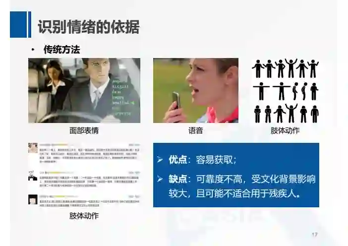 传统识别情绪的方法包括面部表情、语音和肢体动作。这些数据比较容易获取,但是可靠度不是很高,受文化背景影响较大,也不太适用于残疾人。