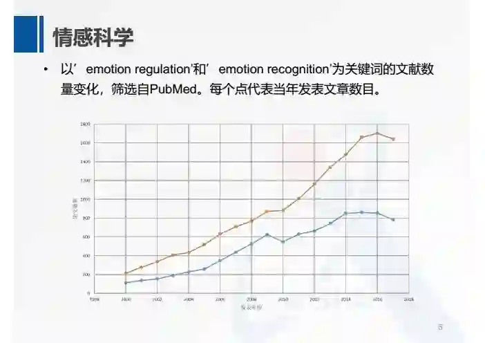 以’emotion regulation’和’emotion recognition’作为关键词搜索文章,我们发现相关研究研究逐步增加,最高有每年1700篇左右。