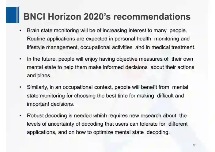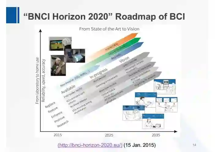 上图是欧洲关于脑机接口发展的路线图,是Horizon2020的计划,涉及脑机接口的研究、提高、增强、恢复和替代。