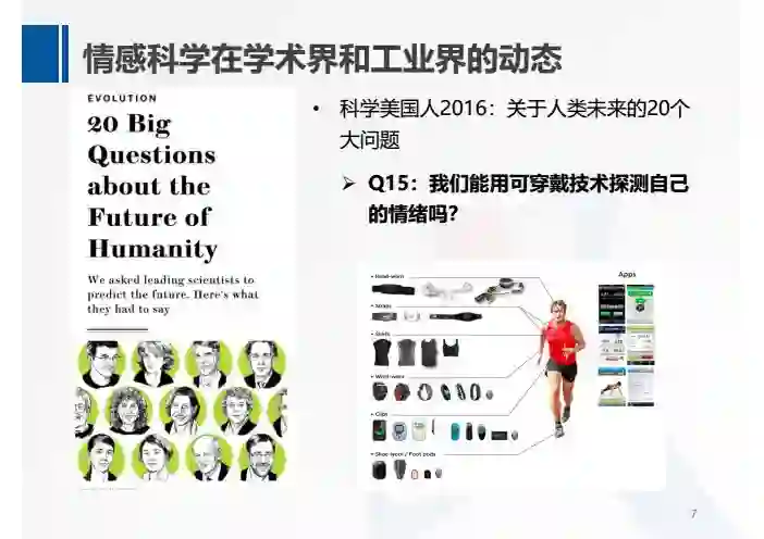 2016年在《科学美国人》上有关于人类未来的20个大问题,其中一个是“我们能用可穿戴技术来探测自己的情绪吗”,说明我们还是希望能够了解自己的情绪。现在经常有人戴手环,使用各种APP,来记录每天走了多少步,吃了多少卡路里的食物,希望借助各种外部探测手段来了解自己。从这个意义上来说人们需要了解自己的情绪,进而来调控情绪。