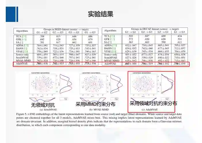 上图红色框里是源领域的变分自编码,蓝色框里是目标领域的变分自编码,他们在隐含层是共享的。我们想学习的这些隐含的表示,使二者隐含表征的距离更小,相当于加了约束。另外一方面,源领域内做分类学习,领域间要对抗,使得两个领域隐含表征分布接近,同时使得隐含表征在源领域内有很好的性能。所以目标函数包括图中三个部分。