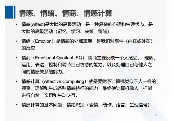 情感是大脑的高级活动,它是一种复杂的心理和生理状态,高级活动包括记忆、学习、决策和情绪等。情绪是情感的一个外部表现,是我们对事件内在或外在的反应。一个成功的人通常要同时具备高智商和高情商。情商反映一个人控制调节自己情感的能力,以及处理自己与他人之间情感关系的能力。情感很重要,它会影响我们做决策。情感计算要赋予计算机像人一样的观察理解和生成情感特征的能力,最终使得计算机像人一样进行自然亲近和生动的交互。情感计算中基本问题包括情绪识别。