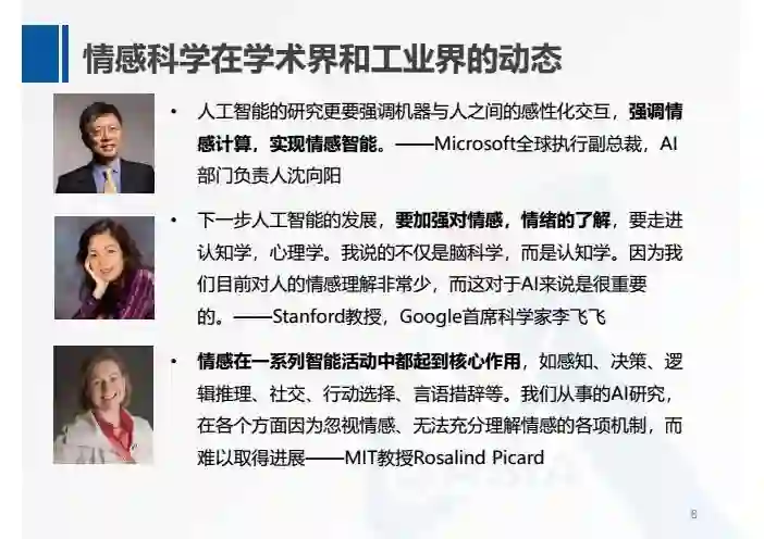 下面介绍一下情感科学在学术界和工业界的动态。微软全球执行副总裁沈向阳认为,人工智能的研究要强调机器人与人之间的感性化交互,强调情感计算,实现情感智能。李飞飞教授认为要加强对情感情绪的了解。MIT的Rosalind教授认为情感在一系列智能活动中都起到核心作用,如感知、决策、逻辑推理、社交、行动选择、言语措辞等。AI研究如果忽视情感,就难以取得进展。