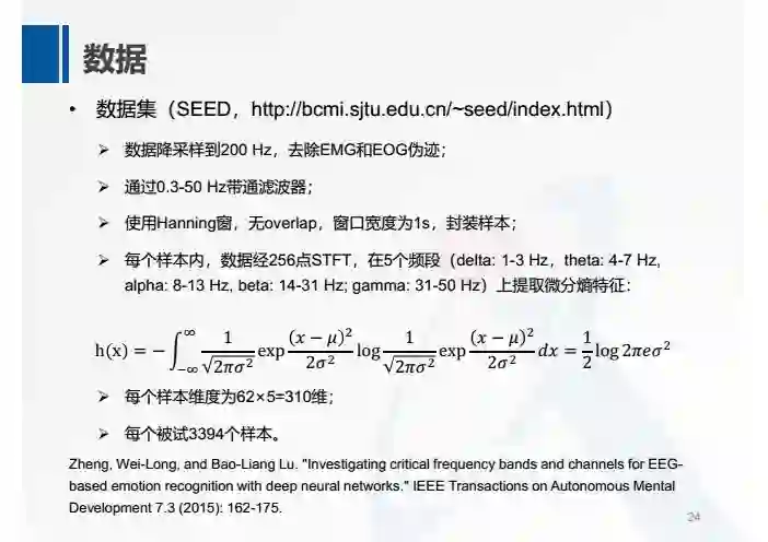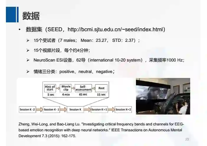 首先介绍一下数据集。这个数据集SEED是上海交通大学吕宝粮教授提供的,有15个被试,看15个视频片断,每个约有4分钟。受试者看完之后要对自己的情绪进行评估,然后进行休息。情绪分成三类,包括积极的、中性的、和负面的情绪。电影都是《唐山大地震》《泰囧》这种刺激性比较强的。