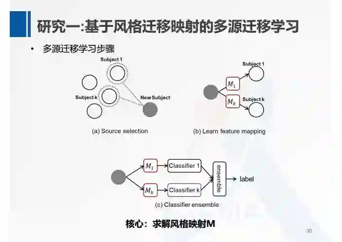 这个过程包括这样上图三个步骤。首先,我们有很多个源,来了新被试后,要从以前被试者中选择合适的然后迁移到新的被试上,也就是进行源的选择。第二步是特征映射,把以前的源和现在的目标之间建立一个映射关系,这里通过一个变化矩阵学习M,新被试可以通过M映射回来。最后,将以前的分类器集成得到这个标签。核心问题是如何学习M。