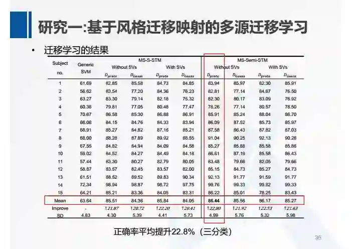这是迁移学习的结果,比较之前利用的一般的模型,这个模型是把很多被试的数据放在一起进行训练,比如说被试前70%进行训练,后面30%进行测试,得到一个分类器,它相对于单个样本训练模型更加鲁棒。最后结果是三分类情况下平均正确率提升22.8%。