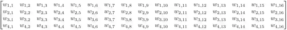 假设我们有一个4×4的输入,目标是把它转换成2×2的输出。这时,如果我们用的是前馈网络,我们会把这个4×4的输入重新转换成一个长度为16的向量,然后把这16个值输入一个有4个输出的密集连接层中。下面是这个层的权重矩阵W: