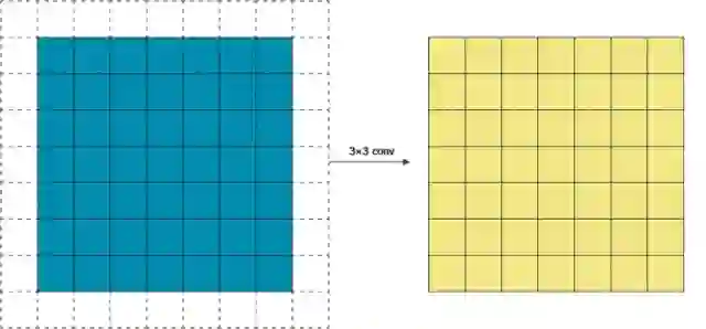 如果你仔细看了上文中的gif,你会发现我们把5×5的特征矩阵转换成了3×3的特征矩阵,输入图像的边缘被“修剪”掉了,这是因为边缘上的像素永远不会位于卷积核中心,而卷积核也没法扩展到边缘区域以外。这是不理想的,通常我们都希望输入和输出的大小应该保持一致。