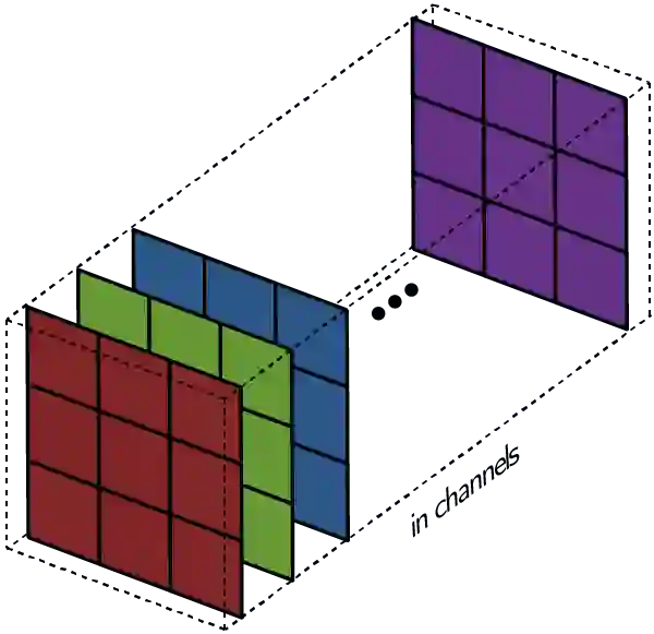 这意味着对于每个输入特征,卷积执行的操作是使用9个参数进行转换。它关注的不是每个特征究竟是什么,而是这个大致位置都有什么特征。这一点很重要,理解了它,我们才能进行深入探讨。