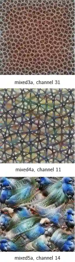 这种感受野的扩大允许卷积层将低级特征(线条、边缘)组合成更高级别的特征(曲线、纹理),正如我们在mixed3a层中看到的那样。而随着我们添加更多Stride层,网络会显示出更多高级特征,如mixed4a、mixed5a。