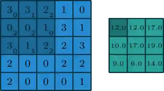 这和全连接层很不一样。在上图的例子中,我们的输入有5×5=25个特征,而我们的输出则是3×3=9个特征。如果这是一个全连接层,输入25个特征后,我们会输出包含25×9=225个参数的权重矩阵,每个输出特征都是每个输入特征的加权和。