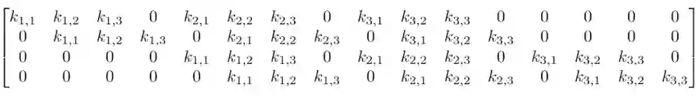 虽然卷积的卷积核操作看起来很奇怪,但它仍然是一个带有等效变换矩阵的线性变换。如果我们在重构的4×4输入上使用一个大小为3的卷积核K,那么这个等效矩阵会变成: