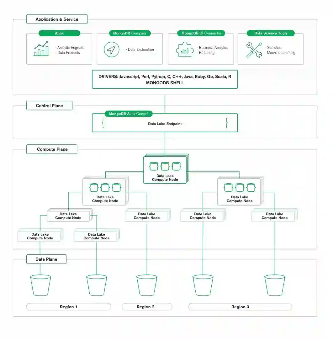通过 MongoDB 查询语言,用户可以将一个技能集应用于数据湖和事务数据库。它不仅仅是与 Data Lake 一起使用的查询语言,而且也兼容 MongoDB 驱动程序、MongoDB Shell、MongoDB Compass 和 MongoDB BI Connector。这意味着使用 JavaScript、Perl、Python、C、C ++、Java、Ruby、Go、Scala、R 和许多其他语言编写的应用程序也可以使用 MongoDB 用户之前部署的驱动程序访问 Data Lake。数据科学家可以使用 R 驱动程序支持下的 R Studio 工具 或者 Python 驱动程序支持下的 Jupyter 笔记本来进行统计、机器学习和数据湖分析。