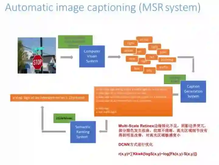 说说我们最近做的一些工作,这是一个MSR系统,我们在用DCNN的方法做优化,用image captioning来做这个系统的时候会面临一些问题。在这里用Multi-Scale Retinex技术会存在一些问题,比如边缘锐化不足,阴影边界突兀比较大, 部分颜色发生扭曲等。我们试过了很多方法,也做了很多参数的优化处理,发现效果都不是很好,Hinton出了capsule之后,我们立马开始去对物体坐标性的点进行描述处理,而不用BP的反向处理方式,现在我们正在做一些算法的猜想证明。