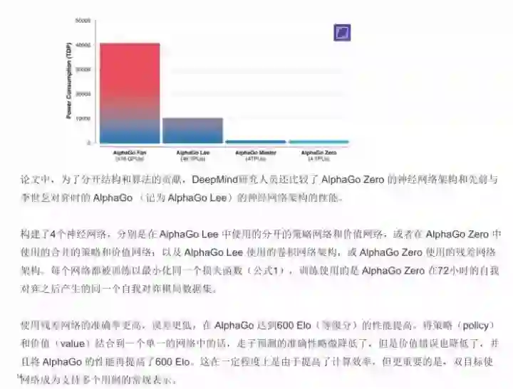 在这里还有一件非常好玩的事情,他们用了张量处理单元(TPU),同时还做了一系列的说明,在训练网络时完全用了分布式的训练方式,用了176个GPU,48个TPU,其实AlphaGo Zero比较厉害的地方的是只用了四个TPU去做。DeepMind还比较了AlphaGo Zero的神经网络架构和AlphaGo的神经网络架构的性能,在性能上我就不多说了。