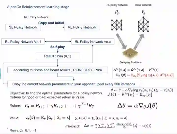 到了做强化学习的时候,它会把原来通过机器学习过来的监督神经网络copy到强化神经网络里,然后进行初始化,让强化神经网络作为对手和另一个强化神经网络进行互相学习,来选择一个最优的结果。具体细节如PPT所示,500次做一次迭代,在这里会用到一些梯度下降的方式。