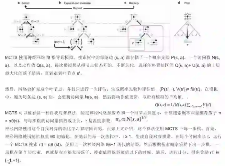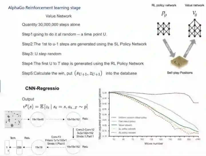 我先说AlphaGo,AlphaGo其实是由两个网络组成的,第一个是人类的经验,第二个是双手互搏、自学习。第一部分是监督策略网络,第二部分是强化策略网络,还有一个价值网络,再加上rollout网络,即快速走棋的网络,这四个网络再加上MCTS,就组成AlphaGo。